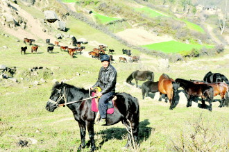 從此以后,李旺勝養(yǎng)馬再也不敢掉以輕心了。每年春天至秋天,他便趕著馬群進(jìn)山了。每天,李旺勝起早吃頓干糧便匆匆上山,奔波一天直到夜幕降臨時(shí)才拖著疲倦的身體回到家里。冬天降雪來(lái)臨前,他便把馬趕回家里喂養(yǎng)。