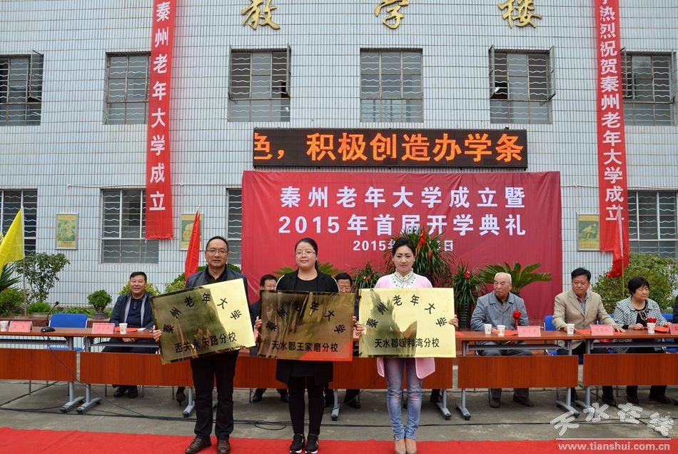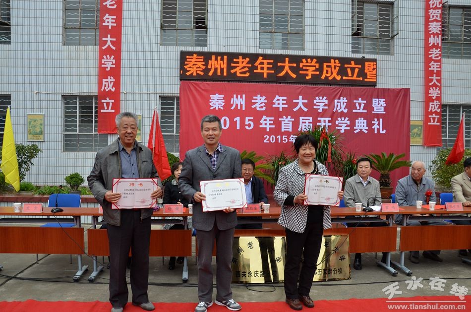 開學(xué)典禮上,秦州區(qū)相關(guān)領(lǐng)導(dǎo)宣讀了關(guān)于成立秦州老年大學(xué)的批復(fù)及老年大學(xué)校領(lǐng)導(dǎo)班子聘任通知并發(fā)放聘任證書,同時為秦州大學(xué)三個分校授牌。