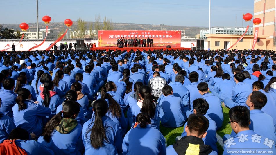 為了大力弘揚(yáng)優(yōu)秀傳統(tǒng)文化,踐行社會主義核心價值觀,深入貫徹落實十八屆六中全會精神、市區(qū)“黨代會”及人大政協(xié)“兩會”精神,2016年11月11日,由秦州區(qū)委宣傳部、區(qū)文廣局、區(qū)教體局、團(tuán)區(qū)委主辦,區(qū)文化館、天水四中承辦的 “新征程-新跨越”2016秦州區(qū)傳統(tǒng)文化進(jìn)校園活動在充滿活力的天水四中隆重舉行,區(qū)委常常委、宣傳部長曹亞玲做了重要講話。區(qū)人大副主任崔麗霞,區(qū)政協(xié)副主席郭金霞、羅榮昌、李紅軍參加了活動。區(qū)文廣局局長秦毅敏主持活動并為天水市四中頒發(fā)了傳統(tǒng)文化普及教育示范基地銅牌,區(qū)教體局黨委副書記柏甲戌、區(qū)文化館館長趙暉先后致辭和介紹有關(guān)情況。