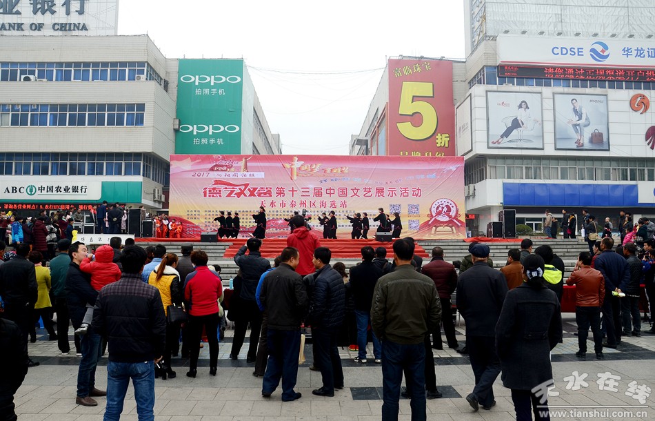 12月11日,第13屆“德藝雙馨”中國文藝展示秦州選拔活動在龍城廣場舉行!豆Ψ蛐∽印、《孫氏精編四十式太極拳》、《牧民歌唱毛主席》、《在那東山頂上》、《歡樂頌》等精彩節(jié)目輪番上演,將現(xiàn)場氣氛一次次推向高潮,贏得觀眾的陣陣掌聲。