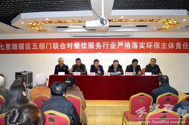七里墩轄區(qū)五部門聯(lián)合對餐飲服務(wù)行業(yè)嚴(yán)格落實環(huán)保責(zé)任主體,召開動員會議,為加強餐飲行業(yè)環(huán)境保護(hù)責(zé)任主體工作的管理,3月8日,秦州區(qū)七里墩轄區(qū)五部門(區(qū)執(zhí)法局、區(qū)食藥監(jiān)局七里墩所、區(qū)環(huán)衛(wèi)局東關(guān)中隊、區(qū)環(huán)保局七里墩片區(qū)和七里墩辦事處)在秦州區(qū)衛(wèi)生監(jiān)督所二樓會議室召開,對全轄區(qū)160家餐飲服務(wù)單位參加了動員會。