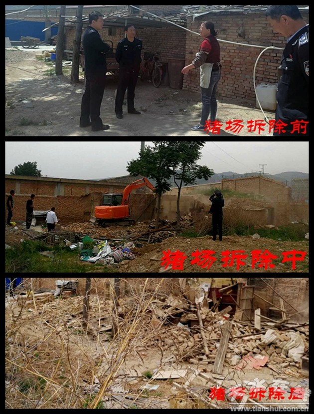 執(zhí)法人員有序疏導人員轉(zhuǎn)移財物,數(shù)頭肉豬被安全運走。對拆除現(xiàn)場實施安全警戒,實行晝夜值班,確,F(xiàn)場安全有序。隨著重型機械的轟鳴聲,面積約240平方米的豬場和砂廠逐漸被清拆。