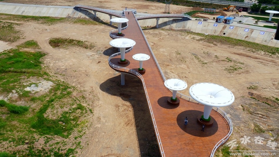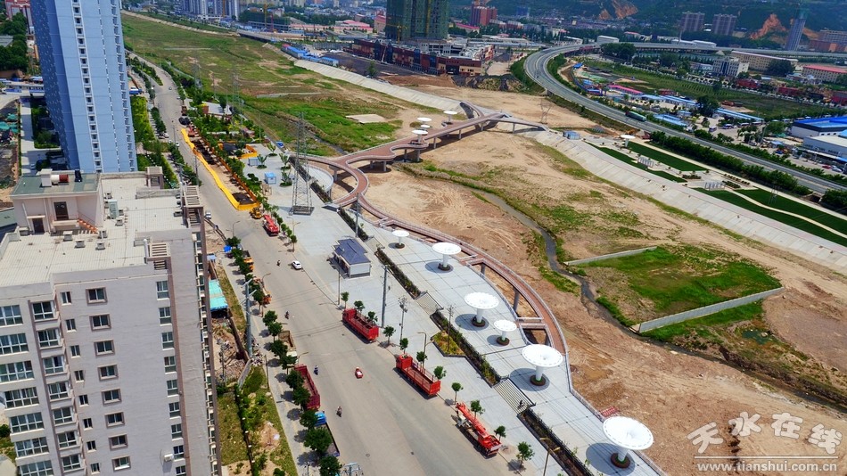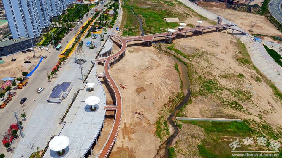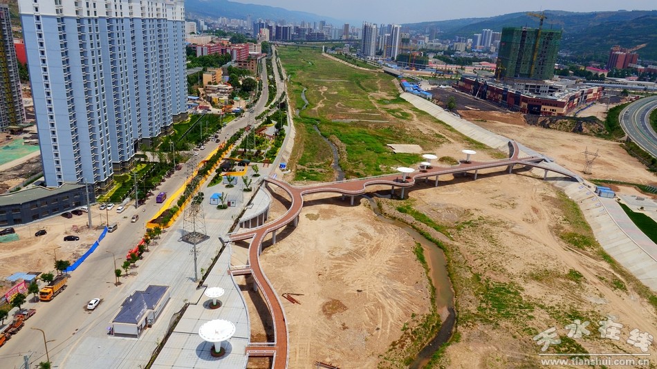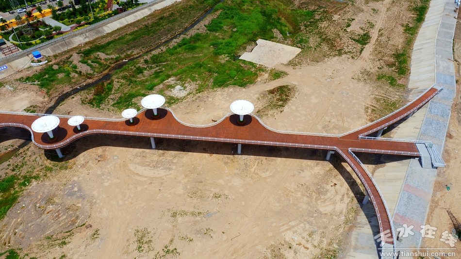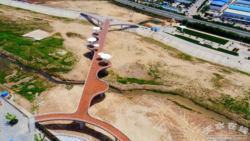 (圖為秦州區(qū)藉河生態(tài)公園人行景觀橋 天水在線6月27日航拍)