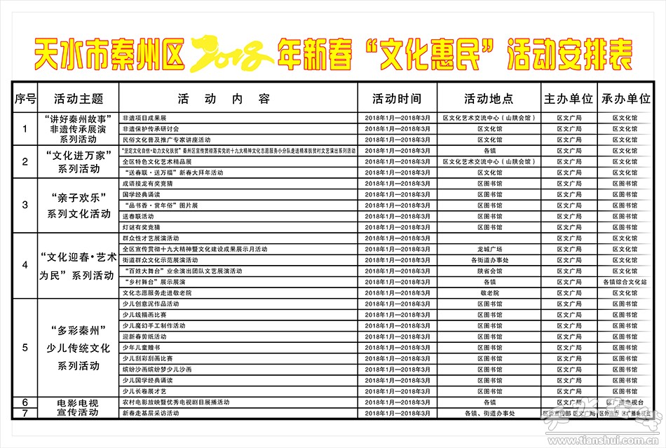 (秦州區(qū)外宣辦 劉可)記者從1月8日召開的秦州區(qū)2018年新春文化活動(dòng)安排會(huì)上獲悉,今年新春期間,秦州區(qū)共組織開展各類文化活動(dòng)40項(xiàng)。除“貫徹十九大·邁步新征程”秦州區(qū)踐行社會(huì)主義核心價(jià)值觀頒獎(jiǎng)晚會(huì)等6項(xiàng)已開展的活動(dòng)外,其余36項(xiàng)活動(dòng)將在1至3月間密集開展。這些活動(dòng)中,既有社火匯演、玉泉觀上九廟會(huì)、元宵節(jié)燈展等保留“節(jié)目”,也有迎新春“文藝快閃”、新春年貨花燈節(jié)、青鵑山滑雪品茗、南山云端戶外健身等新“節(jié)目”。