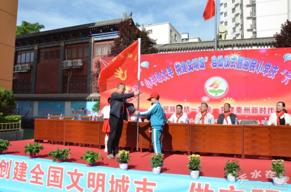 5月30日,大城街道辦事處在天水市公園小學(xué)舉行了“小手牽大手 共建文明城”慶六一主題活動,街道負(fù)責(zé)人正在向文明創(chuàng)建“小衛(wèi)士”授旗。