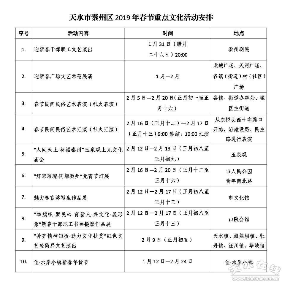 秦州區(qū)外宣辦1月18日訊(劉可)記者從18日召開的秦州區(qū)2019年新春文化活動安排會上獲悉,今年新春期間,秦州區(qū)共組織開展各類文化活動40項。除“春天的故事·我的深情為你守候”合唱音樂會等已開展的活動外,其余活動將在1至3月間密集開展。這些活動中,既有社火匯演、玉泉觀上九廟會、元宵節(jié)燈展等保留“節(jié)目”,也有迎新春干部職工文藝演出等一些新的“節(jié)目”。