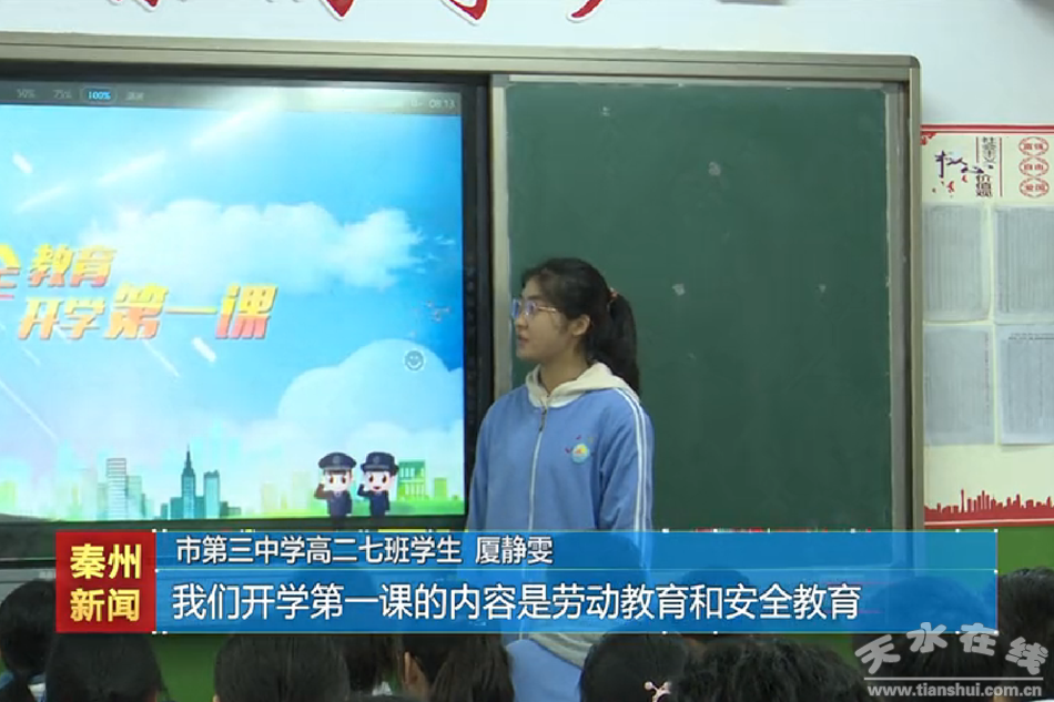 與建三小學一樣,天水市第三中學也將安全教育、勞動教育作為開學的第一課,各班級通過觀看教育專題片、學生領讀、領講的方式,學習安全勞動教育內(nèi)容,提高學生們的自我安全保護意識,自覺抵制不文明交通行為。