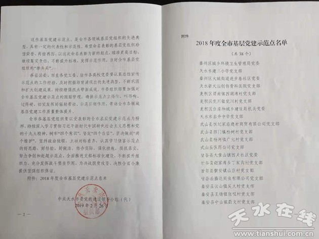 秦州區(qū)城鄉(xiāng)環(huán)衛(wèi)局黨委一直以來深入學(xué)習(xí)貫徹習(xí)近平新時代中國特色社會主義思想和黨的十九大精神,充分發(fā)揮黨組織的政治核心和監(jiān)督保障作用,樹牢“四個意識”,堅定“四個自信”,堅決做到“兩個維護”,充分發(fā)揮全體黨員的先鋒模范作用,帶領(lǐng)9個基層黨支部以黨建凝聚人心、促進服務(wù),以黨建促進發(fā)展、提升質(zhì)量,全力建設(shè)基層學(xué)習(xí)型、服務(wù)型、創(chuàng)新型黨組織。2019年2月27日,在召開的天水市組織部長會議上,秦州區(qū)城鄉(xiāng)環(huán)衛(wèi)局黨委被天水市委組織部授予“全市基層黨建示范點”榮譽稱號。