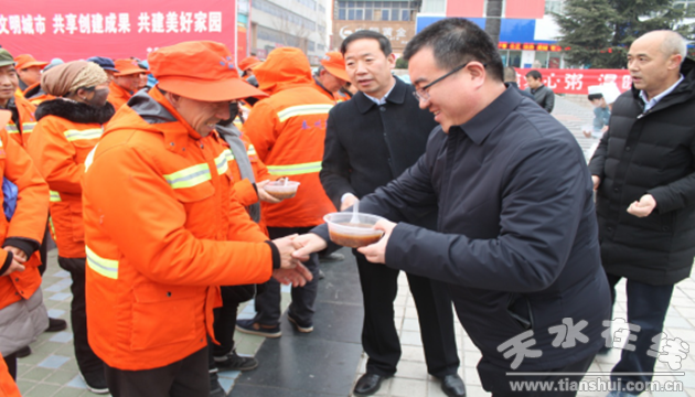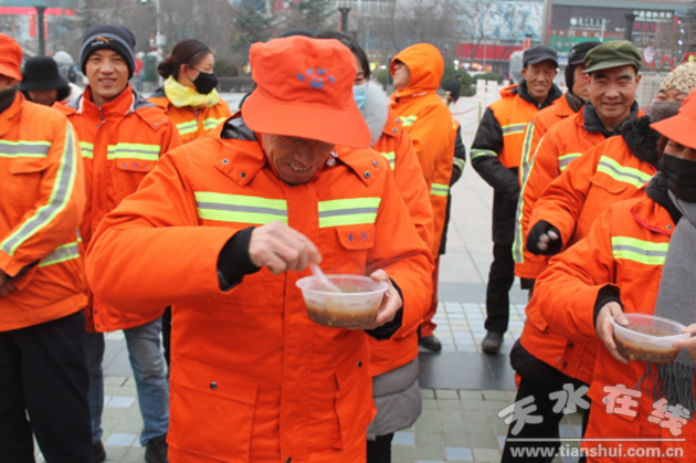 1月2日上午,秦州區(qū)總工會聯(lián)合愛心企業(yè)全席美食城開展了“香飄臘八粥、溫暖環(huán)衛(wèi)工”慰問環(huán)衛(wèi)工人活動,為那些在寒冷中仍然堅持在一線的環(huán)衛(wèi)工人帶去了一分暖意和關懷。