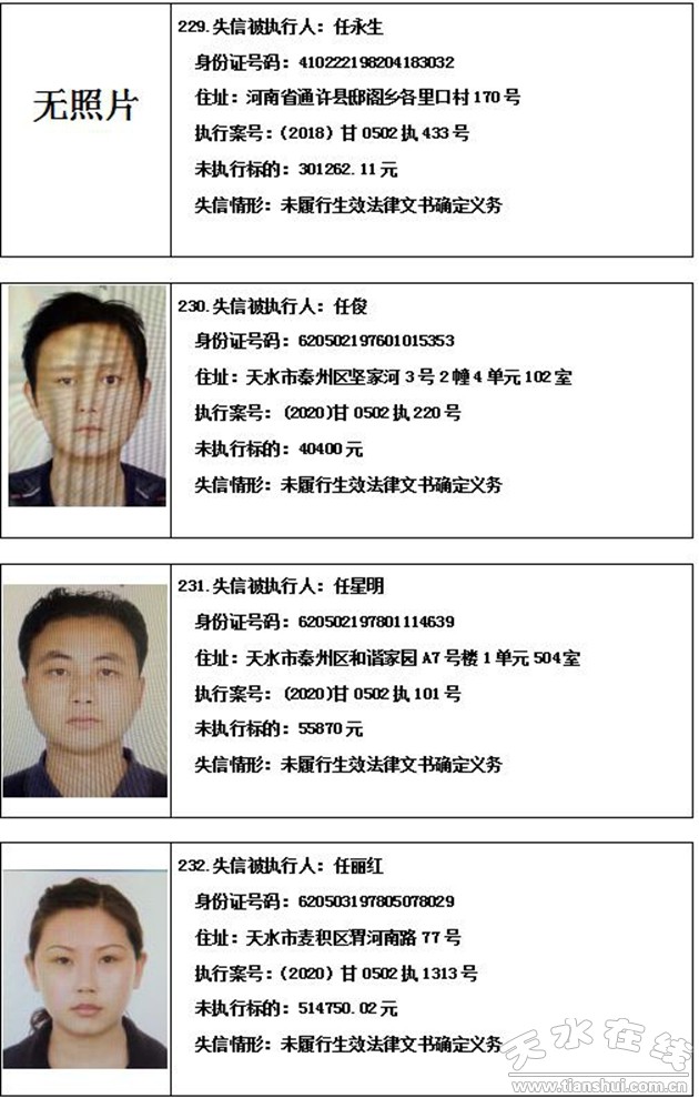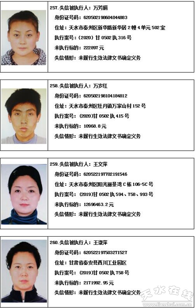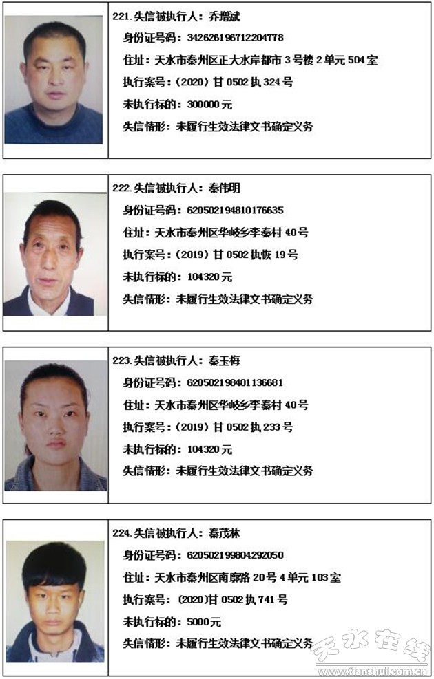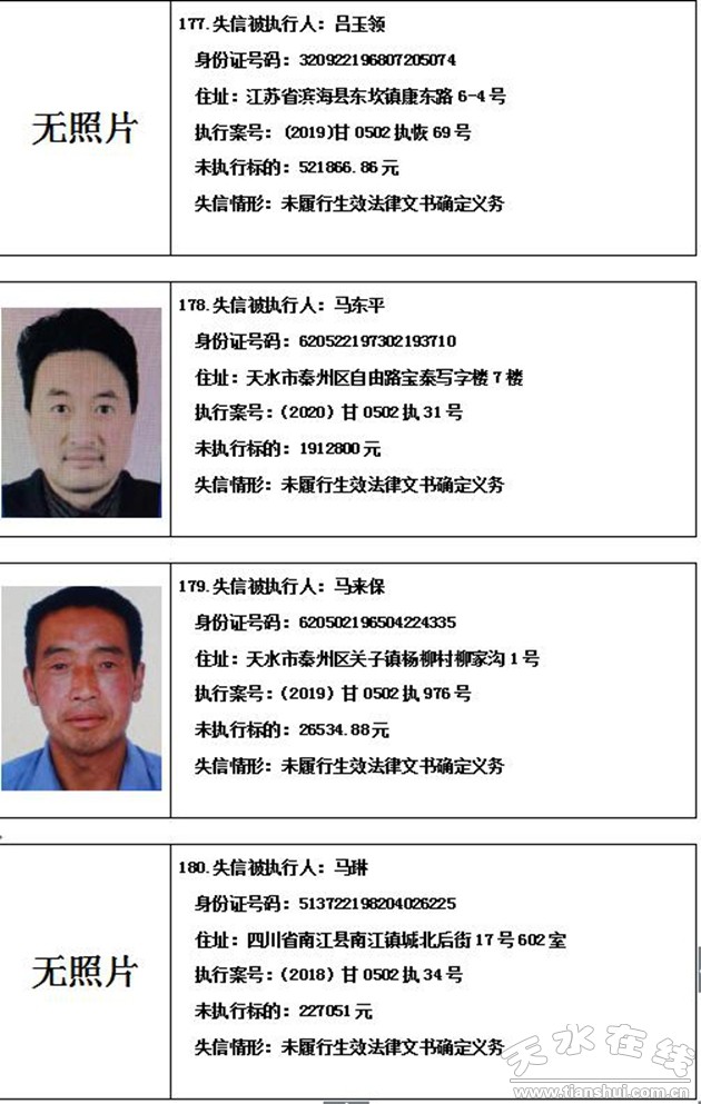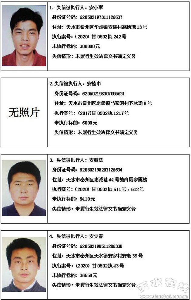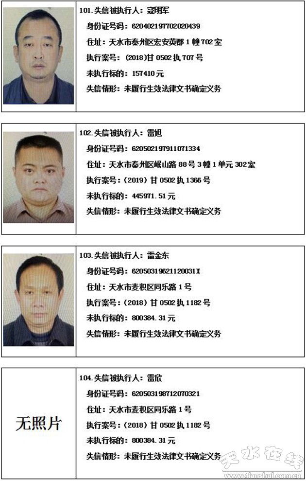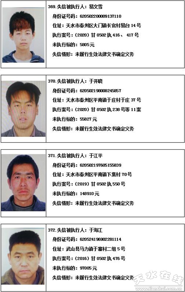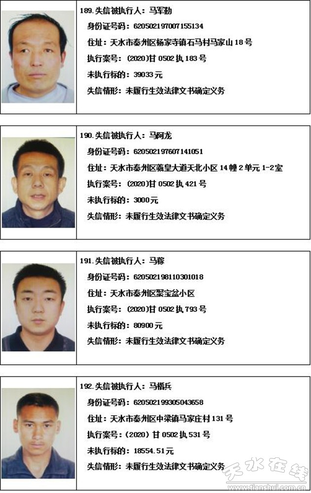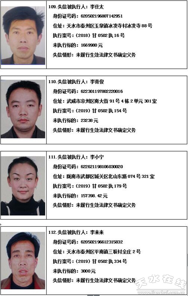 為進(jìn)一步制裁規(guī)避執(zhí)行行為,保障勝訴當(dāng)事人的合法權(quán)益,推進(jìn)社會誠信體系建設(shè),依照《中華人民共和國民事訴訟法》、《最高人民法院關(guān)于公布失信被執(zhí)行人名單信息的若干規(guī)定》等法律、司法解釋的有關(guān)規(guī)定,現(xiàn)對一批已進(jìn)入執(zhí)行程序,且尚未全部履行義務(wù)的被執(zhí)行人進(jìn)行媒體曝光,并敦促所有被執(zhí)行人自覺履行生效法律文書確定的義務(wù),通告如下: