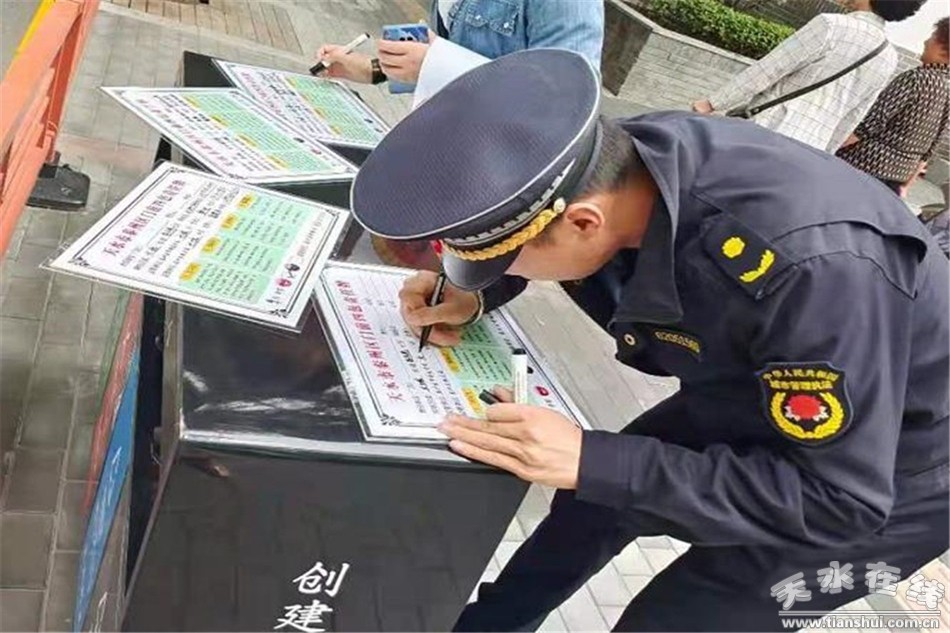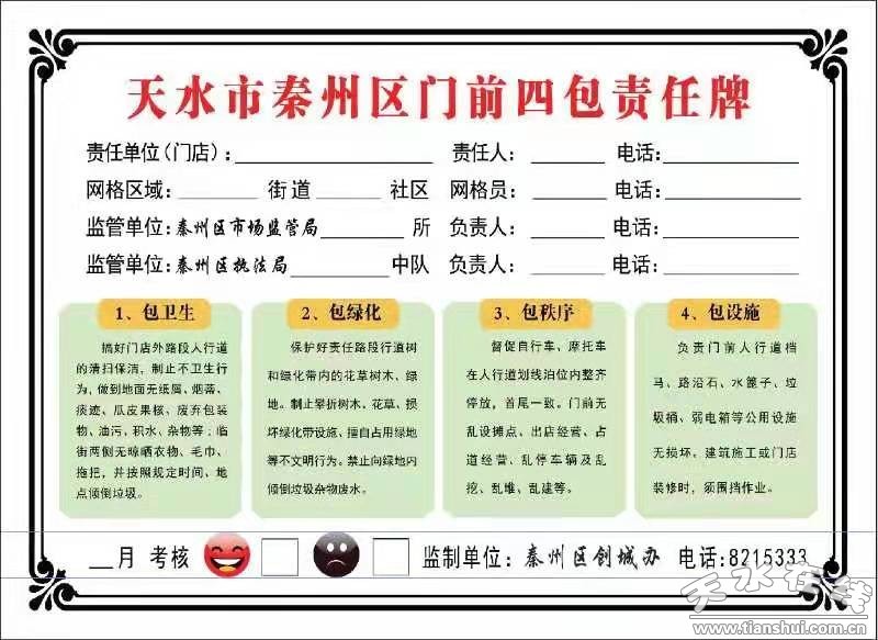 秦州區(qū)融媒體中心9月14日訊 為創(chuàng)建整潔、美觀、干凈、宜居的生活環(huán)境,提升城市形象,調(diào)動社會力量參與創(chuàng)建全國文明城市工作,秦州區(qū)三城聯(lián)創(chuàng)辦公室特將“天水市秦州區(qū)門前三包責(zé)任牌”更換為“天水市秦州區(qū)門前四包責(zé)任牌”,并制定“門前四包”責(zé)任協(xié)議書,推進(jìn)周考核紅黑臉,提高管理標(biāo)準(zhǔn),為文明城市創(chuàng)建工作添磚加瓦。為加強(qiáng)沿街門店管理,消除致亂根源,構(gòu)建群眾參與、共防共治的管理工作格局,推進(jìn)創(chuàng)建文明城市工作深入開展,根據(jù)《甘肅省城市市容和環(huán)境衛(wèi)生管理辦法》,由街道辦事處作為“門前四包”管理工作的行政責(zé)任主體,秦州區(qū)市場監(jiān)管局、秦州區(qū)執(zhí)法局作為監(jiān)管單位,委托商鋪、企事業(yè)單位對門前責(zé)任區(qū)域內(nèi)的各類違反市容環(huán)境衛(wèi)生管理實(shí)施辦法的行為,進(jìn)行制止、規(guī)范,自覺維護(hù)門前設(shè)施、綠化、衛(wèi)生和市容秩序,情節(jié)嚴(yán)重的向街道或政府相關(guān)職能部門舉報(bào),依法實(shí)施糾正和查處。