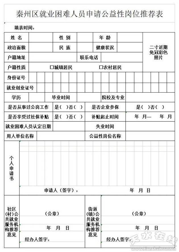 3.《天水市秦州區(qū)就業(yè)困難人員申請(qǐng)公益性崗位推薦表》