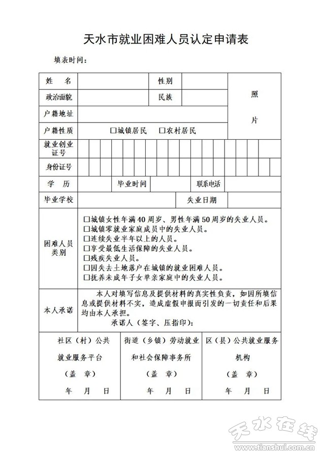 2.《天水市秦州區(qū)就業(yè)困難人員認(rèn)定申請(qǐng)表》