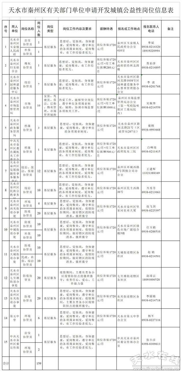 1.天水市秦州區(qū)區(qū)直有關(guān)部門單位申請(qǐng)開發(fā)城鎮(zhèn)公益性崗位信息表