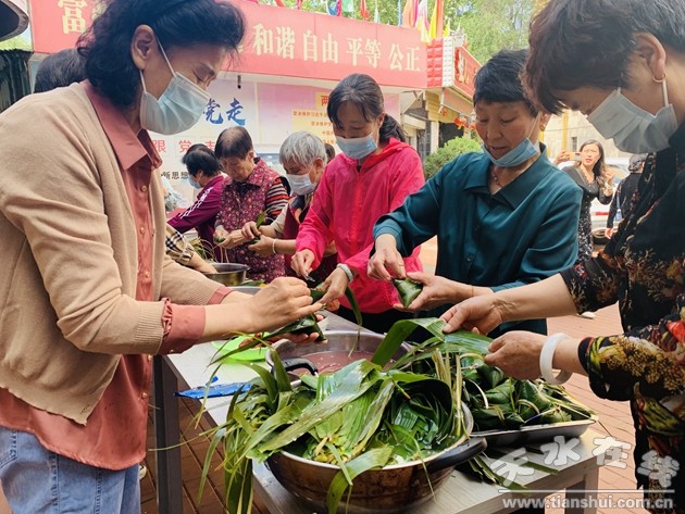活動當天,社區(qū)工作人員、志愿者們提前準備好糯米、粽葉、紅豆、大棗、黑米等材料擺放在社區(qū)門口活動廣場,居民群眾員兩人一組、三人一群話習俗、嘮家常、包粽子,紛紛展示各自的手藝,拿粽葉、卷粽葉、裝糯米、壓結(jié)實、封粽口、捆扎實,一起合作,互相交流,不一會兒,一個個結(jié)實而飽滿的粽子在大家的齊心協(xié)力下中誕生了,經(jīng)過兩個多小時的辛勤勞作,近千顆粽子陸續(xù)包好。