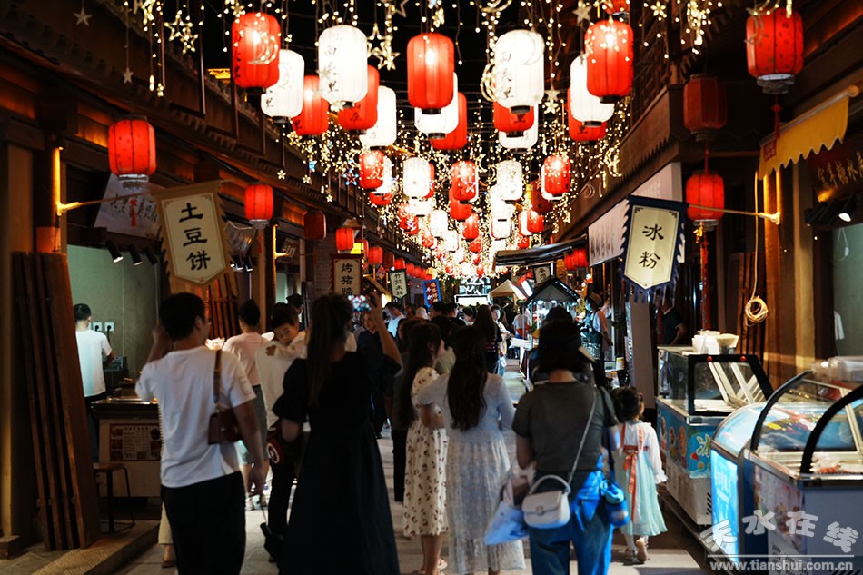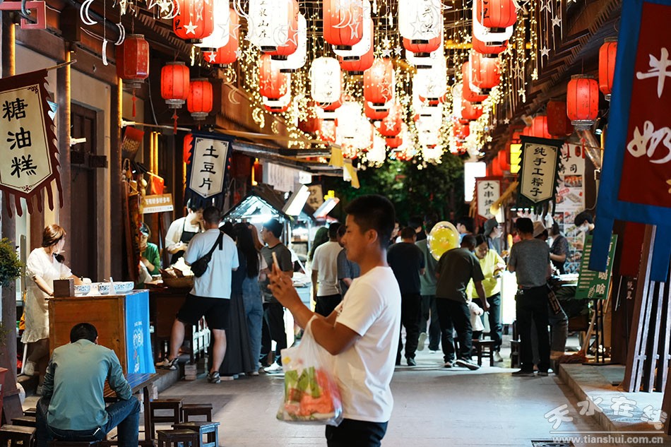夜幕降臨,天水古城華燈初上,人流如潮,這里的夜市異常熱鬧。酒吧、特色燒烤、啤酒攤成為年輕一族最青睞的夜間消費業(yè)態(tài)。古城內開啟的網絡直播,吸引眾多市民駐足觀看。
