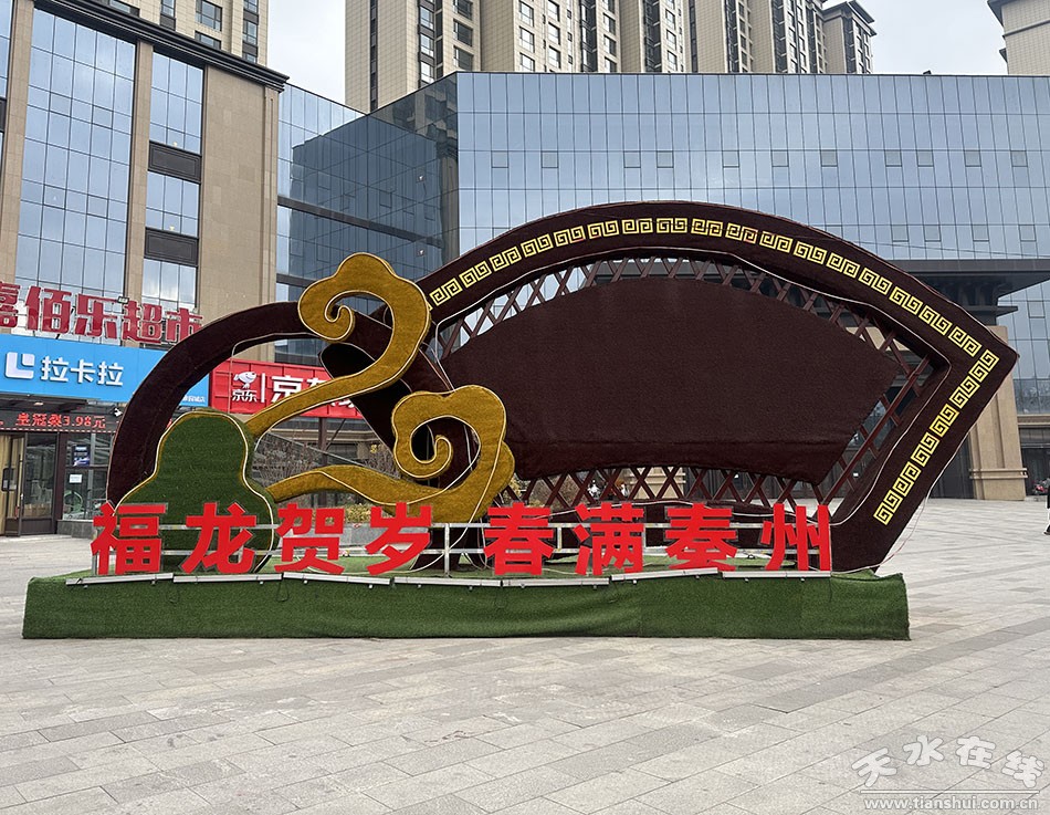 在龍城廣場(chǎng),以“歡度春節(jié)”為主題的綠雕景觀高達(dá)12米,占地面積近500平方米。恢宏大氣的中國(guó)傳統(tǒng)“中國(guó)結(jié)”,讓人眼前一亮,成了新晉過(guò)年賞花“打卡點(diǎn)”。紅旗、五角星、祥云等元素“簇?fù)怼毕,燈籠、燈帶等吉祥如意的新年元素一一呈現(xiàn),將我市的傳統(tǒng)文化與全新技術(shù)手段完美融合,傳達(dá)了秦州人民對(duì)美好生活的向往。