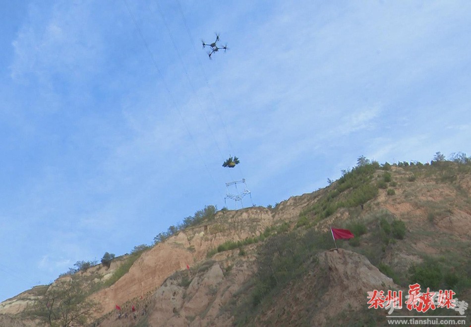 在秦州區(qū)西城區(qū)北山面山綠化工程作業(yè)現(xiàn)場,無人機在工作人員的操作下,將一棵棵苗木騰空吊起,送至山頂?shù)脑灾颤c,再由造林工人進行栽植。