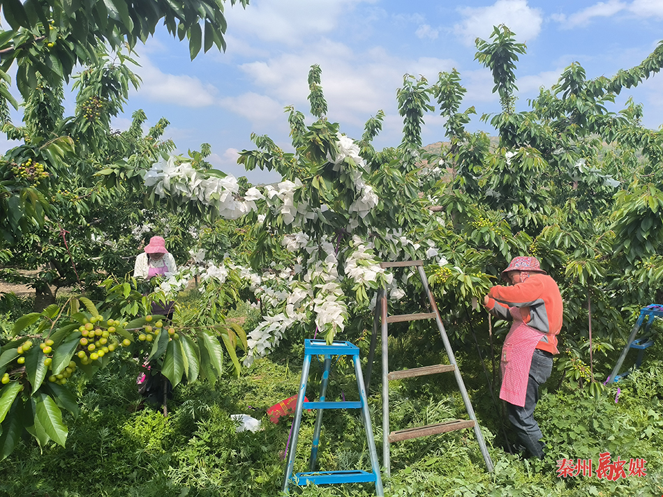 在藉口鎮(zhèn)三合村,櫻桃果園里掛滿了紅綠相間的果實(shí),十幾名村民正將一個(gè)個(gè)白色果袋套在每一顆果子上。展開袋子、將果子套進(jìn)袋子里、捏緊袋口,紙起手落間,一個(gè)個(gè)大櫻桃就穿上了潔白的新衣。