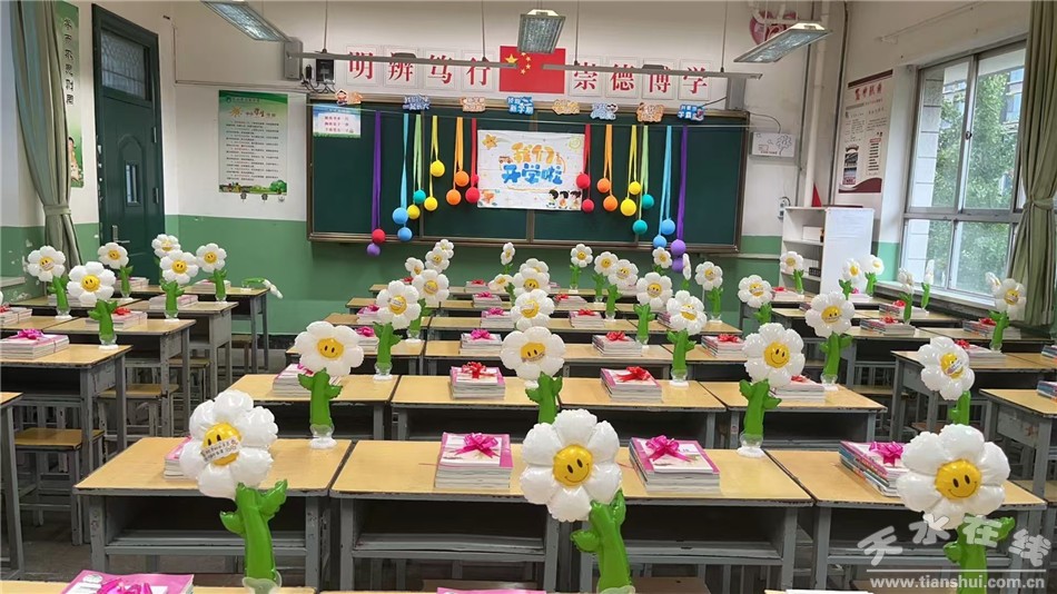 在各班教室里,老師們?yōu)楹⒆觽兙臏?zhǔn)備了獨特的開學(xué)儀式,干凈整潔的座椅,色彩斑斕的氣球,五彩繽紛的黑板報,書香濃郁的新課本,一份份精美的開學(xué)禮品,表達了新學(xué)期各位老師對每一位新生的熱烈歡迎和期望。