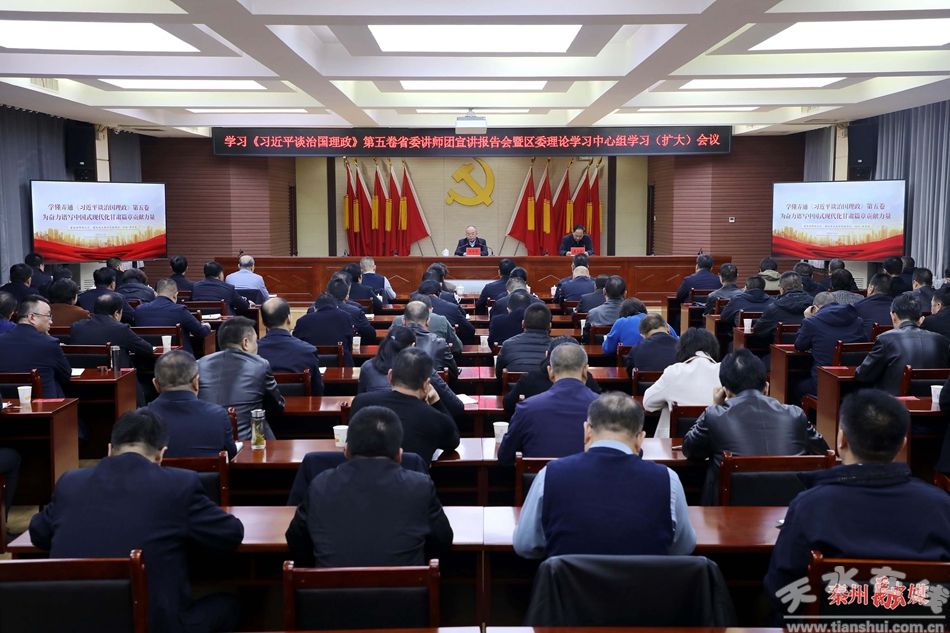 秦州區(qū)融媒體中心11月6日訊(記者 邵千) 11月6日,秦州區(qū)召開學習《習近平談治國理政》第五卷省委講師團宣講報告會暨區(qū)委理論學習中心組學習(擴大)會議。省委講師團成員、省政府文史研究館黨組書記、館長王華存作專題報告。市委常委、區(qū)委書記康泰來主持會議并講話。