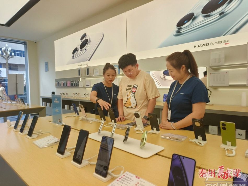 “第三批國補開放以后,消費者進(jìn)店詢問的次數(shù)明顯變多,帶著搶到的資格碼來我們店里進(jìn)行國補的人員也比較多,相比沒有國補的時候成交量明顯上升。”秦州區(qū)解放路世紀(jì)金花華為授權(quán)體驗店銷售人員牛天罡說。