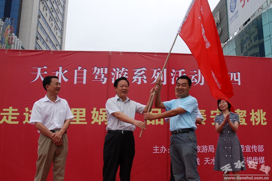 7月19日,“天水在線”自駕游系列活動之四“走進羲里媧鄉(xiāng),品嘗秦安蜜桃”如期舉行。天水市委常委、紀委書記、副市長楊維俊向“天水在線”授旗后,40多輛車150多位自駕游愛好者組成的“天水在線”高端采風團赴羲里媧鄉(xiāng)秦安縣采風。車隊抵達秦安后,在引導車的帶領下繞行秦安縣城一周,感受了秦安縣城市建設風貌;隨后,車隊赴秦安劉坪萬畝桃園基地,攝影采風,品嘗秦安蜜桃;中午,秦安縣在惠園賓館舉行了2009年秦安果品博覽會說明會,并進行了秦安旅游推介活動。下午,游客游覽了興國寺,參觀了秦安縣體育場和秦安小商品市場。