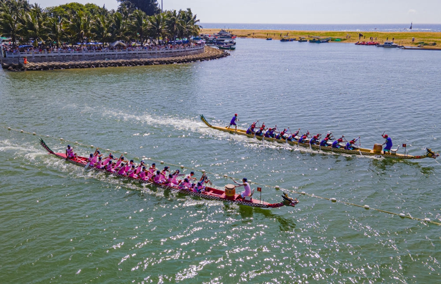 6月22日,海南省瓊海市博鰲水域龍舟賽在緊張進行(無人機照片) 。新華社發(fā)(蒙鐘德攝)