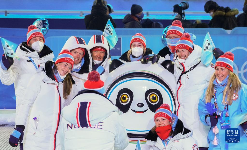 2月14日,觀眾在頒獎廣場與“冰墩墩”合影。新華社記者丁汀攝