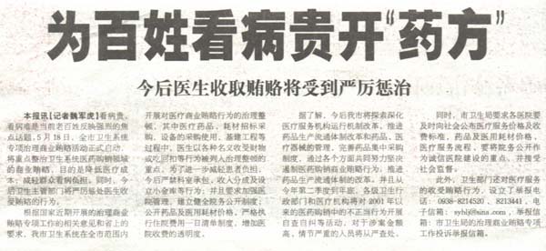 根據(jù)國家近期開展的治理商業(yè)賄賂專項工作的相關(guān)意見和省上的要求,我市衛(wèi)生系統(tǒng)在全市范圍內(nèi)開展對醫(yī)療商業(yè)賄賂行為的治理整頓,其中醫(yī)療藥品、耗材招標(biāo)采購,設(shè)備的采購使用,基建工程等過程中,醫(yī)生以各種名義收受財物或吃回扣等行為被列入治理整頓的重點。為了進一步減輕患者負擔(dān),今后嚴禁科室承包、收入分成及設(shè)立小金庫等行為;并且要求加強醫(yī)院管理,建立健全院務(wù)公開制度,公開藥品及醫(yī)用耗材價格,嚴格執(zhí)行住院費用一日清單制度,增加醫(yī)院收費的透明度。