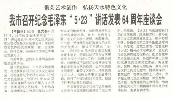 由市委宣傳部、市文化文物出版局、市文聯(lián)聯(lián)合召開的這次文藝座談會,旨在隆重紀念毛澤東同志《在延安文藝座談會上的講話》發(fā)表64周年,深刻理解和學習毛澤東文藝思想,貫徹黨的文藝路線、方針和政策,推動我市文藝精品創(chuàng)作和文學藝術(shù)事業(yè)的繁榮發(fā)展,加快我市特色文化大市建設(shè)步伐。會上,來自市文聯(lián)、市文化文物出版局、市歌舞團、市書協(xié)、天水師范學院等單位的9位相關(guān)負責人,暢談了毛澤東“5·23”《講話》的偉大歷史意義和重大現(xiàn)實意義,回顧總結(jié)了我市文藝事業(yè)和文學藝術(shù)創(chuàng)作工作中取得的成績,對新形勢下如何在加強精神文明建設(shè)中發(fā)揮文藝的作用,如何從我市實際出發(fā),繁榮文藝創(chuàng)作,培養(yǎng)優(yōu)秀文藝人才,加快文藝事業(yè)發(fā)展等問題,進行了全面的探討和交流,提出了許多好的意見和建議。