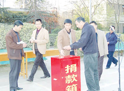當天,在市委、市政協(xié)和天水軍分區(qū)分別舉行的“送溫暖、獻愛心”社會捐助活動上,市領導趙春、宋敬國、張和平、馬湘賢、孫周秦、韓岱成、王世華、張軍、何順德、白朝德、王欽錫、陶元德、張續(xù)善等和市委、市政協(xié)機關干部職工及天水軍分區(qū)全體官兵,積極為災區(qū)和困難群眾捐款,從500元到50元,短短一天時間共捐款38250元。其中,市委、市政協(xié)干部職工分別捐款26400元、7050元,天水軍分區(qū)全體官兵捐款4800元。同時,因公外出的市領導也通過其他途徑進行了捐款。