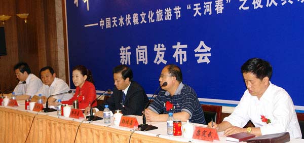 天水在線訊 5月29日下午,“中華情·相約天水——2007(丁亥)年中國天水伏羲文化旅游節(jié)“天河春”之夜慶典晚會”新聞發(fā)布會在天水市陽光飯店舉行!爸腥A情”總導演郭霽紅發(fā)布有關新聞,天水市副市長郭奇若出席新聞發(fā)布會并講話。