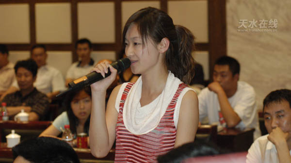 (天水在線記者在“中華情·相約天水——2007(丁亥)年中國天水伏羲文化旅游節(jié)“天河春”之夜慶典晚會”新聞發(fā)布會上提問,記者服裝由深圳閣蘭秀服飾(天水蘭天商廈,盛大金龍三樓專廳)提供。)