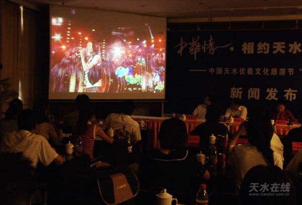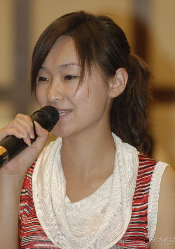 (天水在線記者在“中華情·相約天水——2007(丁亥)年中國天水伏羲文化旅游節(jié)“天河春”之夜慶典晚會”新聞發(fā)布會上提問,記者服裝由深圳閣蘭秀服飾(天水蘭天商廈,盛大金龍三樓專廳)提供。)