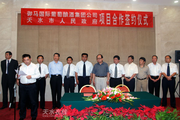 市委副書記、市長張廣智講話說,御馬落戶天水,不僅拓寬了御馬的發(fā)展空間,還展示了發(fā)展高檔御馬葡萄酒的良好前景,同時給地方擴展了財源,為農(nóng)民開辟了一條新的增收渠道,可以說是一舉三得的好事。企業(yè)掙錢,地方發(fā)展,農(nóng)民得實惠。該項目的合作,御馬有信心,天水市縣區(qū)政府同樣有支持御馬服務御馬的堅定信心。愿雙方共同努力,把天水葡萄基地做大做強,把天水御馬的品牌做響做亮。并祝該項目早日開工,雙方在合作與發(fā)展中實現(xiàn)雙贏,共鑄輝煌。