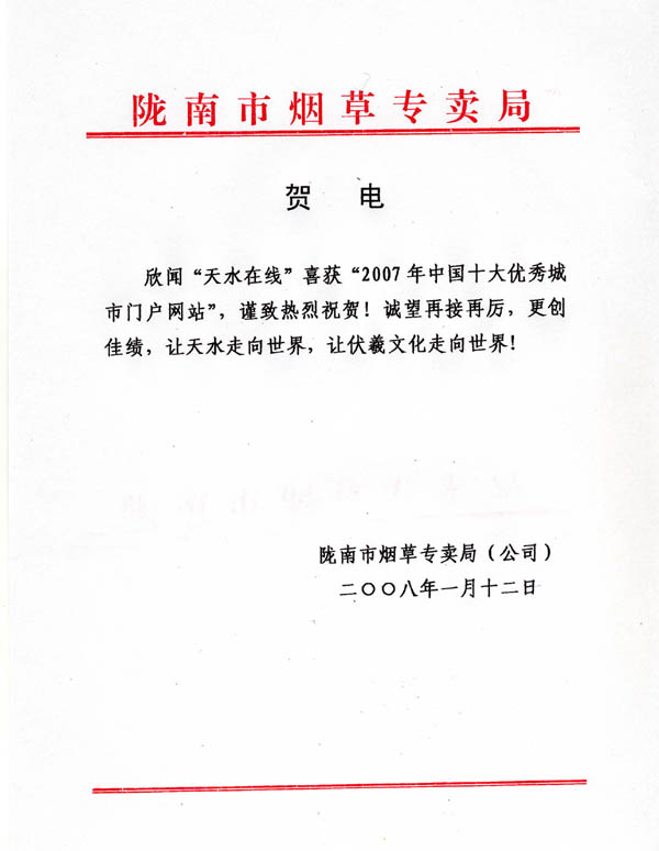 隴南市煙草專賣局(公司)電賀天水在線當選“中國十大優(yōu)秀城市門戶網(wǎng)站”