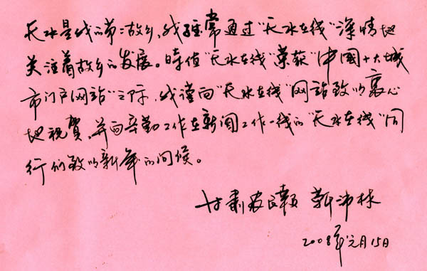 天水是我的第二故鄉(xiāng),我經(jīng)常通過“天水在線”深情的關(guān)注著故鄉(xiāng)的發(fā)展。時值“天水在線”榮獲“中國十大優(yōu)秀城市門戶網(wǎng)站”之際,我謹向“天水在線”網(wǎng)站表示衷心的祝賀,并向辛勤工作在新聞一線的“天水在線”同行們致以新年的問候!