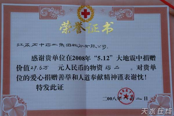 ·江蘇蘇中藥業(yè)集團(tuán)向天水災(zāi)區(qū)捐贈(zèng)27.6萬元藥品(圖)