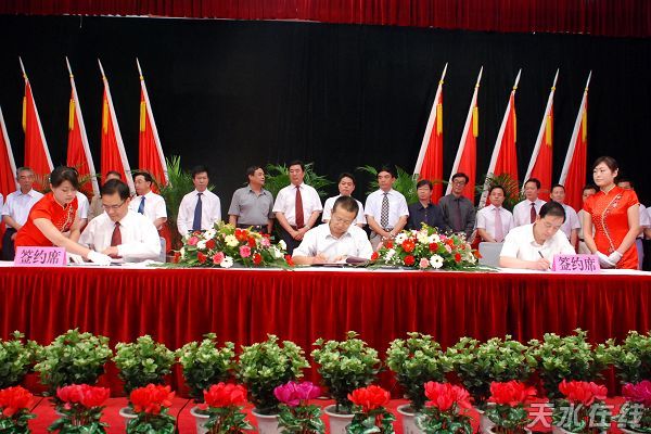 (6月30日下午,天水市迎賓館三樓會(huì)議室燈火輝煌,氣氛熱烈,作為天水市工業(yè)強(qiáng)市大會(huì)主要內(nèi)容之一的工業(yè)戰(zhàn)略合作和重點(diǎn)工業(yè)項(xiàng)目簽約儀式在這里隆重舉行。4個(gè)工業(yè)戰(zhàn)略合作協(xié)議和9個(gè)重點(diǎn)工業(yè)項(xiàng)目簽約投資金額共計(jì)23.96億元,項(xiàng)目建成達(dá)產(chǎn)達(dá)標(biāo)后,每年可實(shí)現(xiàn)銷售收入38.43億元。本次簽約實(shí)現(xiàn)了我市與西電集團(tuán)、中材集團(tuán)、酒鋼集團(tuán)、祁連山水泥集團(tuán)、甘肅省科學(xué)院等央企和省內(nèi)外大企業(yè)集團(tuán)、科研院所的成功聯(lián)姻,標(biāo)志著我市在項(xiàng)目建設(shè)“引強(qiáng)入天、引大入天”方面取得實(shí)質(zhì)性突破。配圖:天水在線)