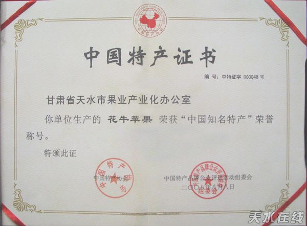 日前,由中國特產(chǎn)協(xié)會、中國食文化研究會等多家單位聯(lián)合并通過中國特產(chǎn)營銷網(wǎng)、中國特產(chǎn)博覽網(wǎng)等數(shù)十家媒體開展的“中國特產(chǎn)品牌公眾評選活動”落下帷幕,天水市果業(yè)產(chǎn)業(yè)化辦公室推選的花牛蘋果,在全國近500種地方特產(chǎn)中,經(jīng)過3個多月網(wǎng)上的激烈角逐,花牛蘋果以10萬余票的高得票率名列評選活動的前茅,榮獲“中國知名特產(chǎn)”稱號。并由中國特產(chǎn)協(xié)會和中國特產(chǎn)品牌公眾評選活動組委會共同頒發(fā)了中國知名特產(chǎn)獎牌及證書。