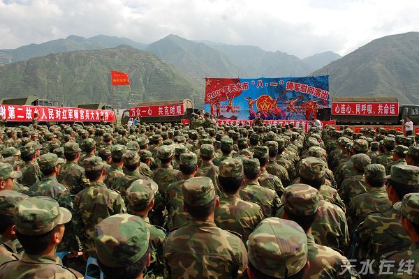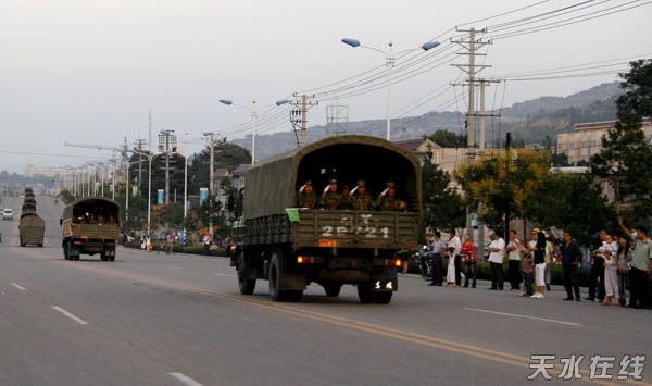 當(dāng)?shù)弥?dāng)?shù)伛v軍子弟兵開赴抗震一線的消息后,市四大組織領(lǐng)導(dǎo)在第一時(shí)間組成慰問團(tuán),冒著余震頻發(fā)、山體滑坡、道路不暢的威脅,連夜趕赴一線慰問。在建軍81周年前夕,市四大組織領(lǐng)導(dǎo)和天水軍分區(qū)、天水預(yù)備役的主要領(lǐng)導(dǎo),率80多人的慰問團(tuán),再次赴前線慰問。在部隊(duì)回撤之時(shí),又舉行了隆重?zé)崃业臍g迎儀式,令我們十分感動(dòng)。