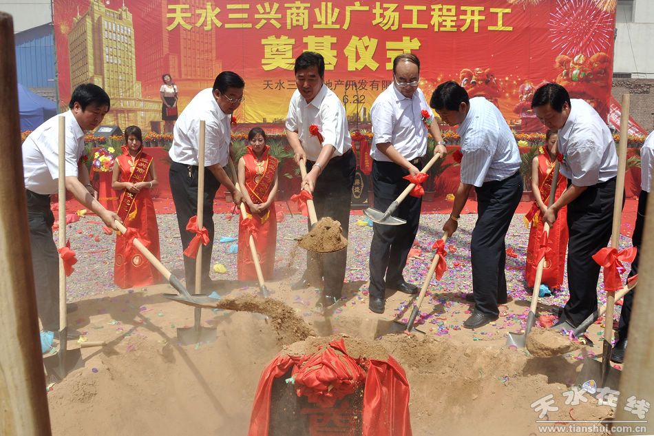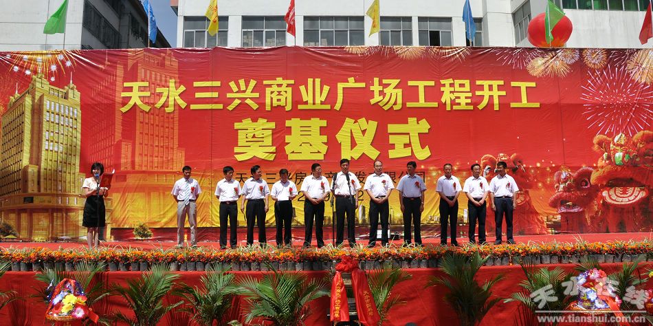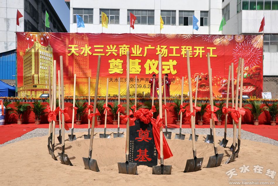 2009年6月22日,原天水飯店舊址建設(shè)工地禮花繽紛,彩旗招展,三興商業(yè)廣場建設(shè)工程舉行奠基典禮。這標(biāo)志著備受全市人民關(guān)注、由天水三興房地產(chǎn)開發(fā)有限公司開發(fā)打造的“甘肅地王”,在我市城市中心區(qū)焦點區(qū)域重新建設(shè)一處極具商業(yè)價值和城市標(biāo)志意義的開發(fā)項目工程正式開工。