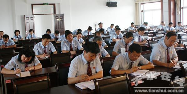 7月13日,天水市中級人民法院召開學習實踐活動分析檢查階段總結暨整改落實階段動員大會,對學習實踐活動分析檢查階段的工作進行了全面總結,對整改落實階段的工作進行了安排部署。市委學習實踐活動第七檢查組領導和中級法院領導班子成員、全體干警參加了會議。