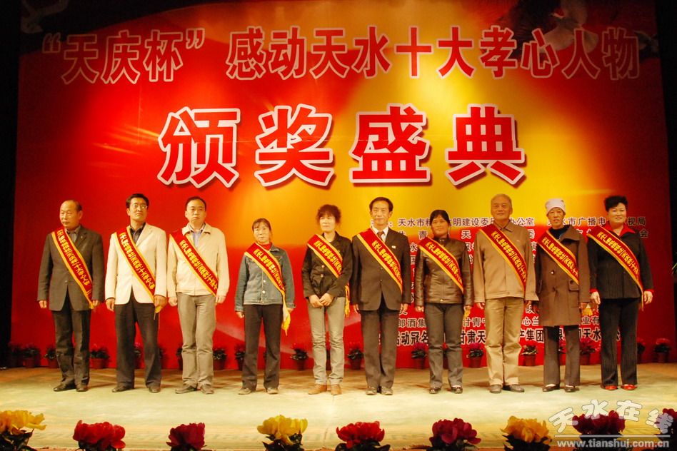 為樹立孝老敬老楷模,倡導(dǎo)敬老養(yǎng)老的中華民族傳統(tǒng)美德,由天水市廣播電影電視局、天水市文明辦、天水市婦女聯(lián)合會(huì)、共青團(tuán)天水市委主辦,天水廣播電視報(bào)社承辦,天慶集團(tuán)天水分公司獨(dú)家冠名的“天慶杯”感動(dòng)天水十大孝心人物評(píng)選活動(dòng)自今年7月初開始至今歷時(shí)三個(gè)月之久,在社會(huì)各界中引起強(qiáng)烈反響,取得巨大成功,評(píng)選結(jié)果于上周揭曉公布!