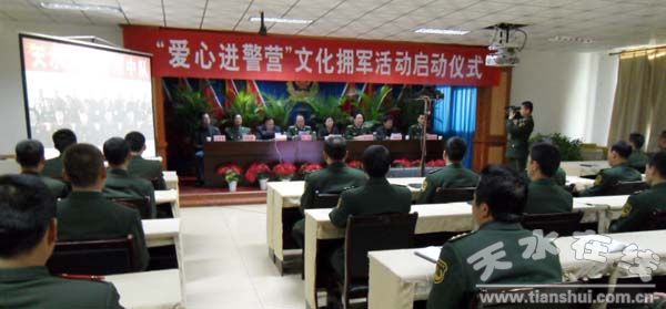 11月6日下午,“愛心進警營”文化擁軍活動啟動儀式在武警天水支隊會議室舉行。武警天水支隊支隊長梁琛、政委薛志春,天水市雙擁辦主任王燕,天水市建設學習型社會研究會會長王晉,甘肅省圣隆裝飾公司總經理章圣架出席了啟動儀式。武警天水市支隊機關以及五縣兩區(qū)各武警中隊通過視頻分會場共600多各官兵參加了啟動儀式。