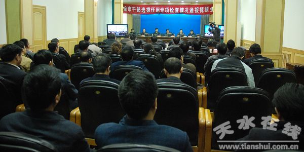 11月12日,在收聽收看了全省干部選撥任用專項(xiàng)檢查情況視頻會(huì)議后,天水市召開全市干部選撥任用專項(xiàng)檢查情況視頻會(huì)議,天水市委書記、市人大常委會(huì)主任張景輝,市委副書記張應(yīng)華,市委常委、常務(wù)副市長(zhǎng)柴金祥,市委常委、紀(jì)委書記楊維俊,市委常委、組織部長(zhǎng)楊繼軍,市委常委、市委秘書長(zhǎng)蔣曉強(qiáng)出席會(huì)議。市長(zhǎng)助理、市政府秘書長(zhǎng)安永,市紀(jì)委、市委組織部班子成員,市直相關(guān)部門負(fù)責(zé)人收聽收看了全省視頻會(huì)議,參加了全市視頻會(huì)議?h區(qū)黨委常委、紀(jì)委和組織部班子成員在各縣區(qū)分會(huì)場(chǎng)收聽收看了視頻會(huì)議。