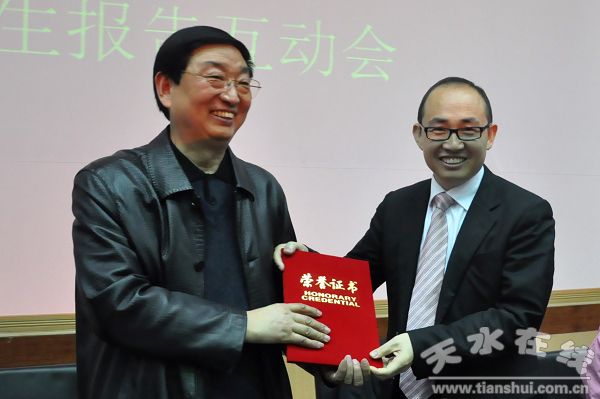 天水師范學(xué)院黨委書記杜松奇向潘石屹先生頒發(fā)榮譽(yù)證書