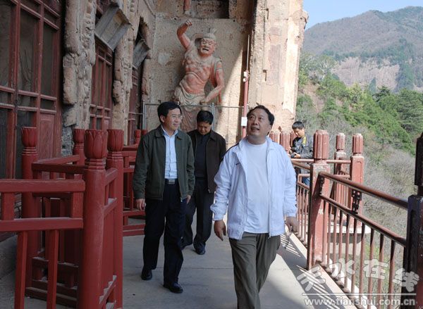 陜西省委宣傳部副部長(zhǎng)、陜西省廣電局局長(zhǎng)任賢良在麥積山石窟參觀考察