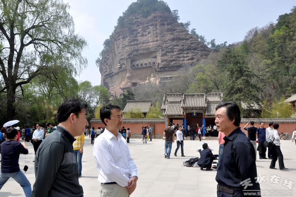 天水市旅游局局長談啟明向麥積山石窟管理所所長華平寧了解旅游情況